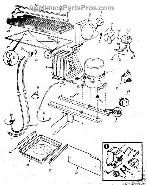 Plastic defrost pan. Evaporator pan hangs from side rails and rests on compressor.