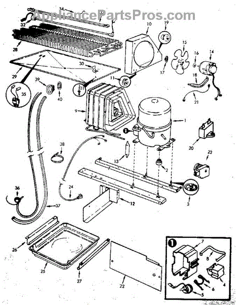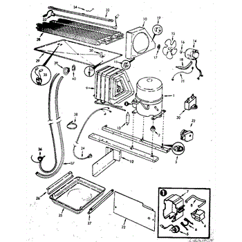 Plastic defrost pan. Evaporator pan hangs from side rails and rests on compressor.