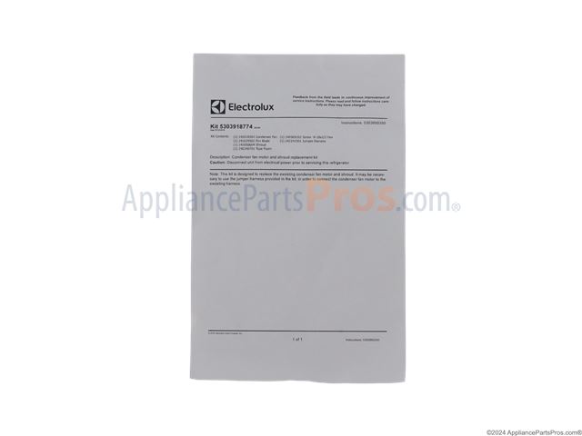 The Condenser Fan Motor Kit is an OEM part for Frigidaire refrigerators. This kit includes the motor and necessary components to replace the existing condenser fan motor in your appliance. It is responsible for circulating air through the condenser coils to dissipate heat outside the refrigerator, helping to maintain the internal temperature and keep the compressor cool.