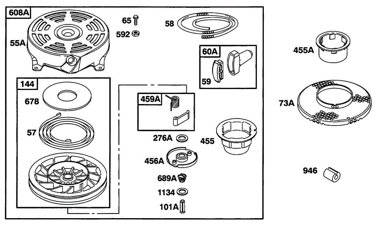 This is an OEM replacement part for the recoil pulley and spring assembly, also called the rewind pulley and spring. The recoil starter, which is operated by a rope, will engage the drive cup on the flywheel, which will start the engine when it is pulled. These are commonly found on lawnmowers and similar outdoor equipment. If the rewind begins to bind when pulling the rope, or if it does not rewind easily, it could indicate that a replacement is needed. In addition, if the plastic on the old pulley is worn and cracked, it is a good idea to replace it before it fails entirely. This OEM assembly comes from the manufacturer and includes the pulley and the spring. The pulley is made from plastic, and the spring is metal. The part can be used for a range of machines and brands. The pulley and spring assembly are compatible with lawnmowers, tillers, and other small engines from brands like Craftsman, Briggs & Stratton, Snapper, Lawn-Boy, Toro, and Cub Cadet.