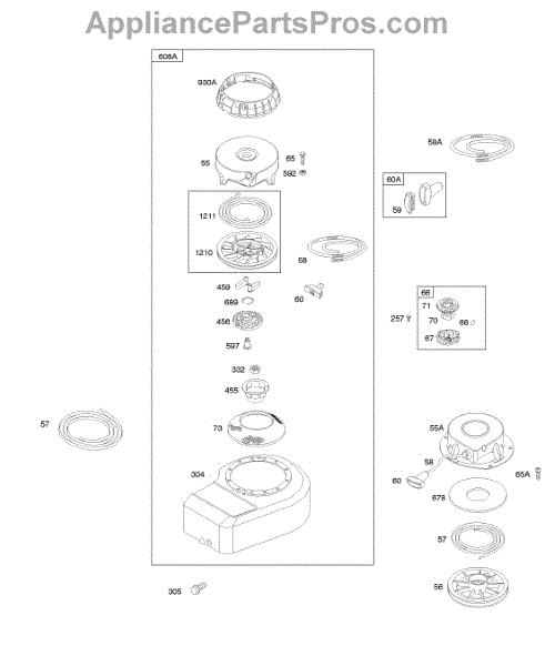 The starter pulley, also known as the recoil pulley, is a standard part that is found on a number of pull-start engines from Briggs & Stratton. This pulley is attached to the starter spring and the flywheel. When the starter rope is pulled, it engages the starter spring, which causes the pulley to react and turn the flywheel, engaging the engine. This pulley and the entire starter system are exposed to constant repetitive motion, which can cause parts to become worn or damaged. This pulley may fail to function or become damaged, which will require a full replacement. This genuine OEM starter recoil pulley is made of durable plastic and produced to exact standards. Briggs & Stratton engines that take this starter pulley can be found on several lawn and garden equipment engines. This durable plastic part is sold as an individual unit and does not include the starter rope or other parts of the starter housing. If those are required, they will need to be purchased separately. This pulley may also be available as part of a full starter housing replacement. Always disengage the spark plug when working on the starter system or engine components and wear gloves for hand protection.