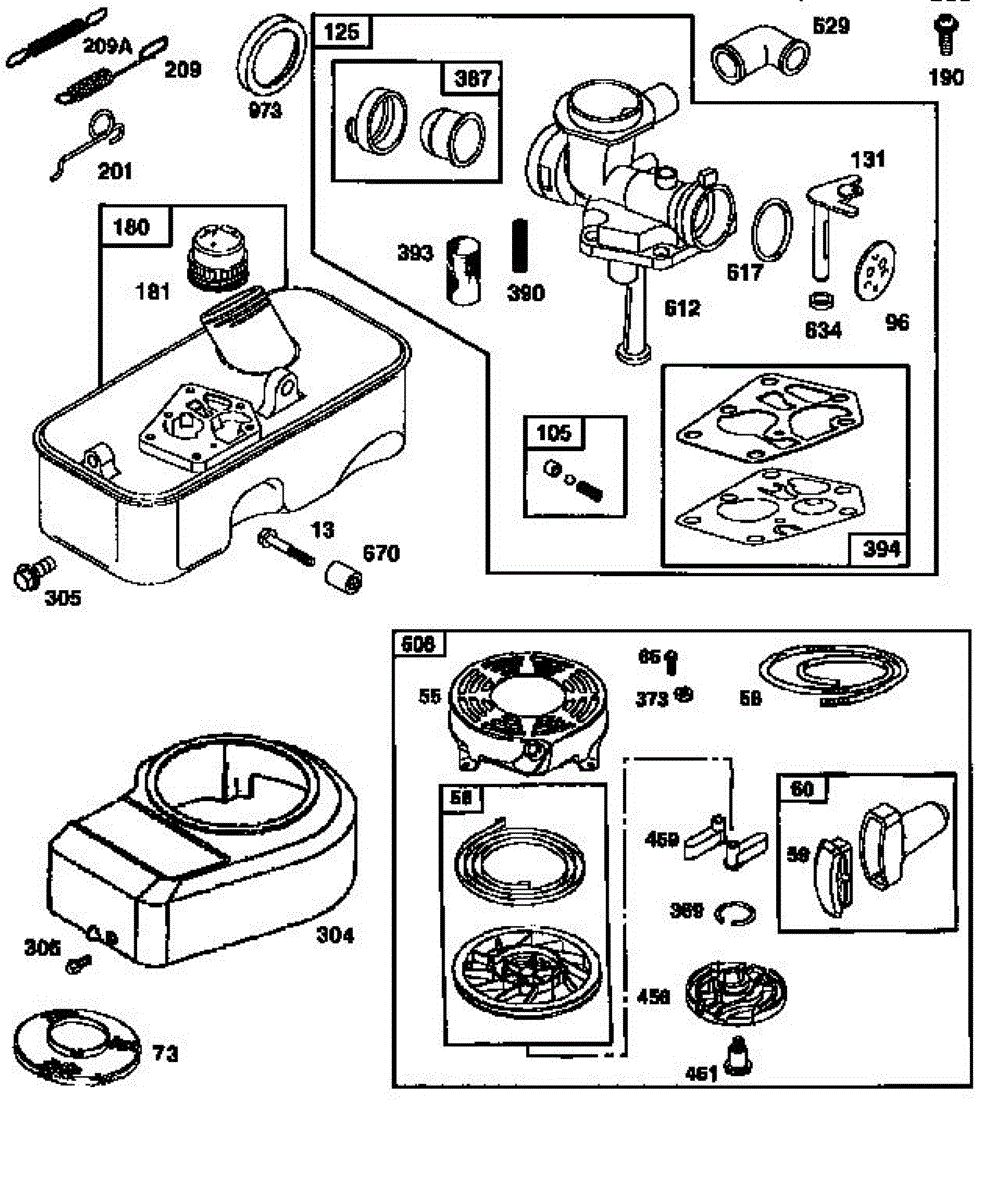 Parts for Briggs & Stratton 9D902-2085-E2: Carburetor And Rewind Starter Assembly Parts