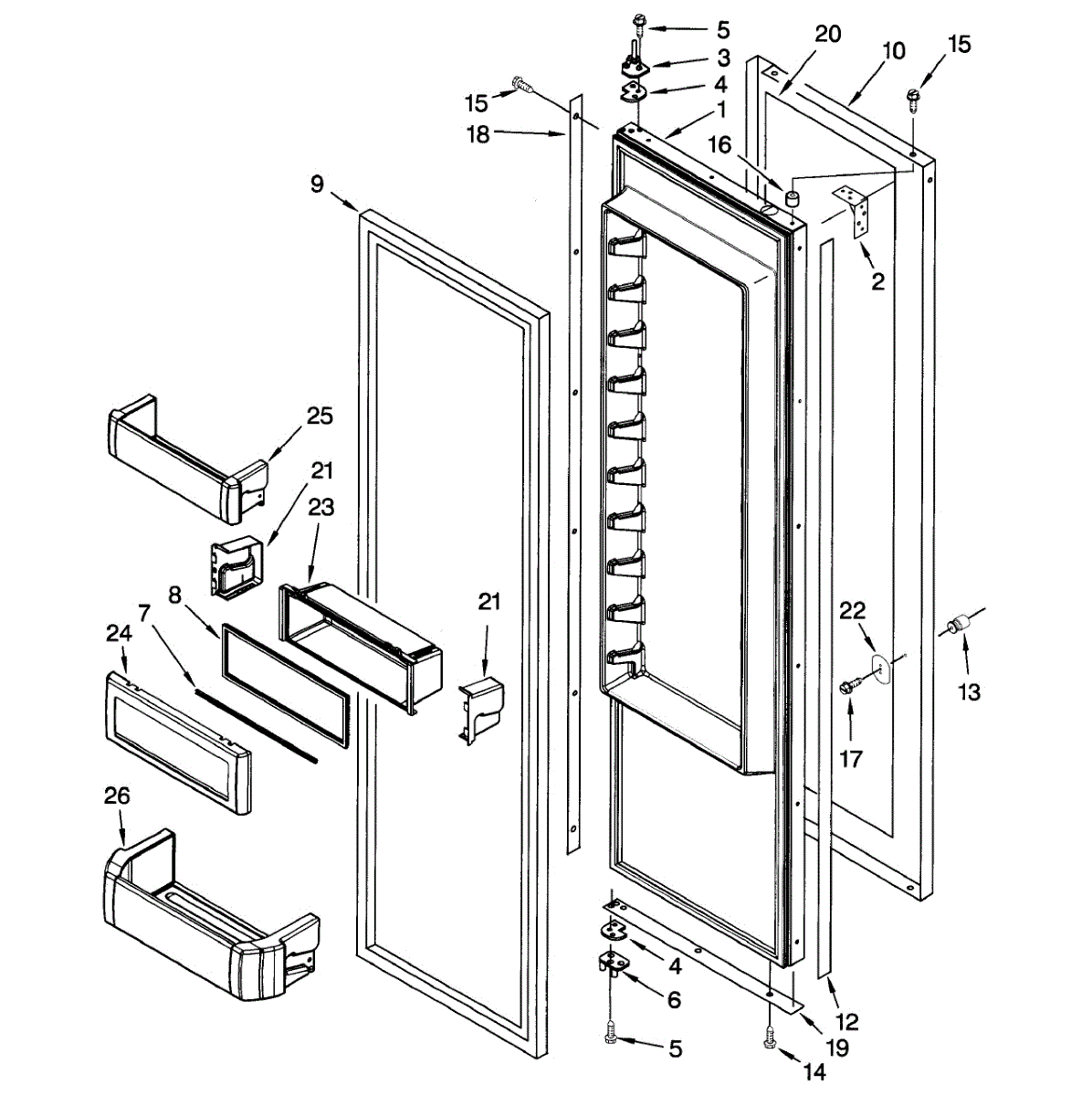 The Dairy Bin is an OEM replacement part for Whirlpool's built-in and integrated refrigerator side-by-side door shelves. It provides a designated space optimized for storing dairy products.