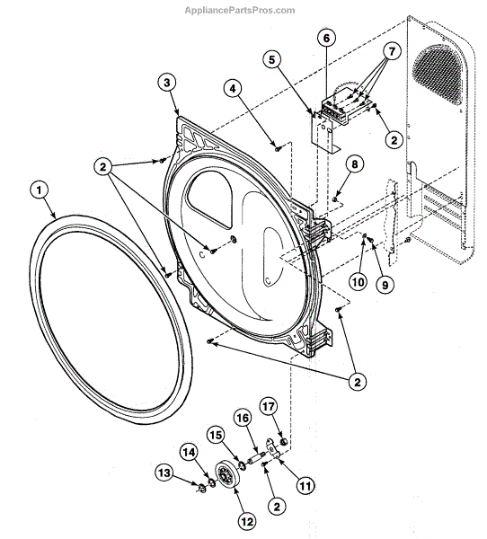 This front bulkhead assembly forms the dryer's front drum support and air seal. Replacing a worn or damaged bulkhead restores smooth drum rotation, reduces noise, and helps maintain proper airflow for consistent drying performance.