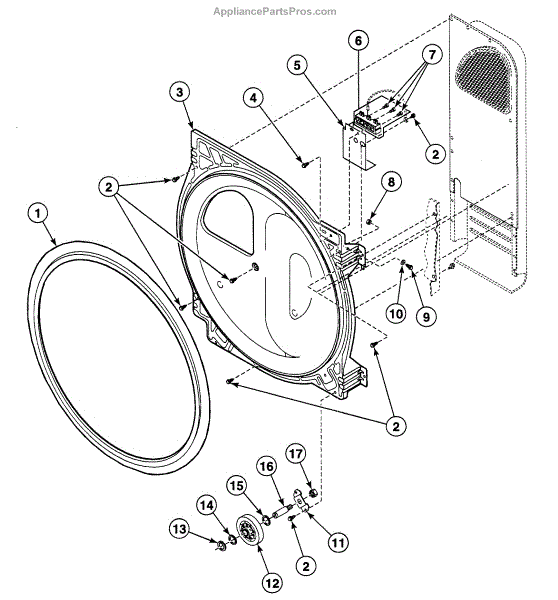 Seals the back of the dryer drum to prevent air leaks and maintain proper alignment. Replace if you notice poor drying or air escaping. Confirm fit with your model.