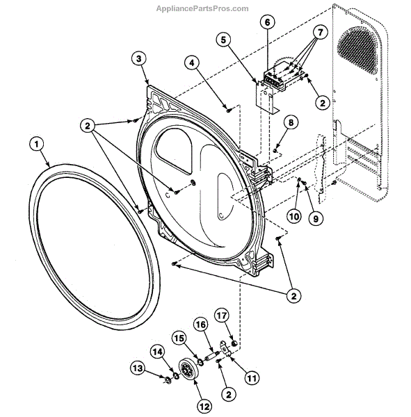 Seals the back of the dryer drum to prevent air leaks and maintain proper alignment. Replace if you notice poor drying or air escaping. Confirm fit with your model.