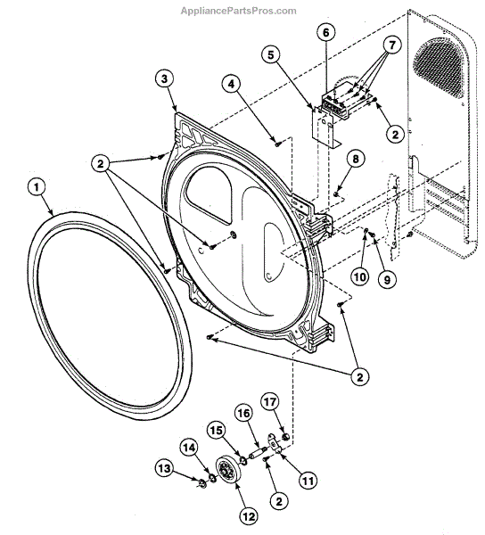 Seals the back of the dryer drum to prevent air leaks and maintain proper alignment. Replace if you notice poor drying or air escaping. Confirm fit with your model.
