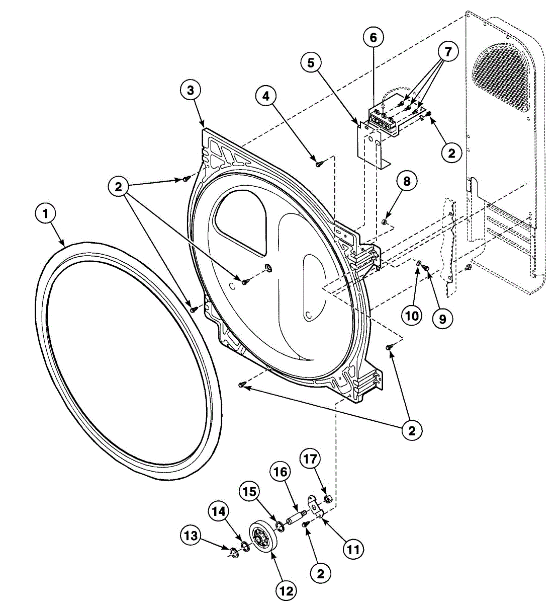 Seals the back of the dryer drum to prevent air leaks and maintain proper alignment. Replace if you notice poor drying or air escaping. Confirm fit with your model.