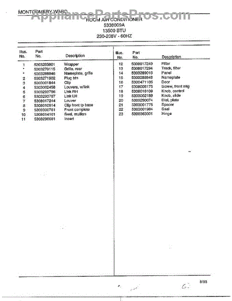 Parts for Frigidaire 4338009A: Room Air Conditioner Page 2 Parts