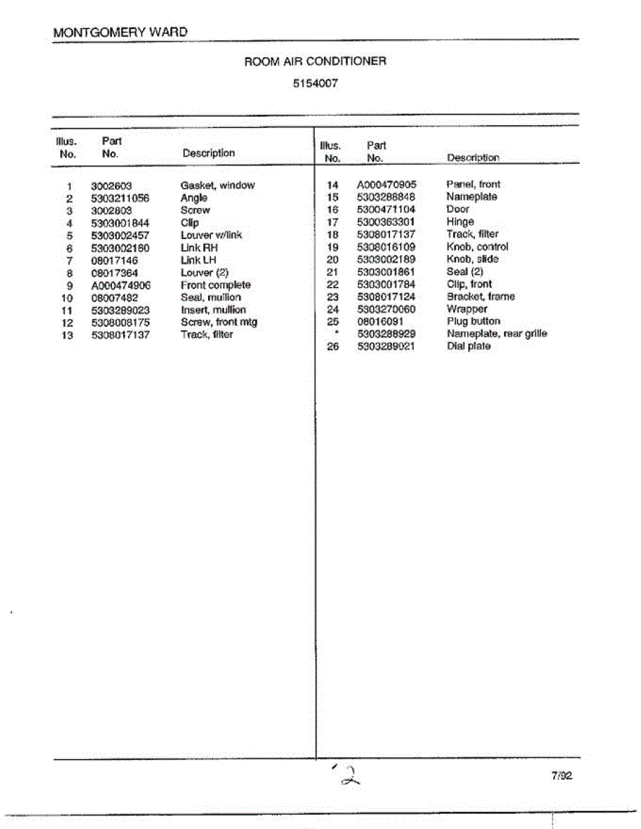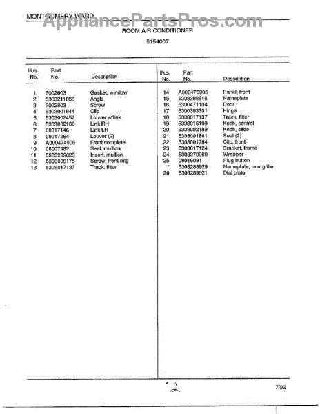 Parts for Frigidaire 5154007: Room Air Conditioner Page 2 Parts