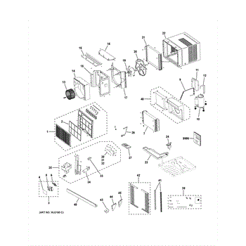 This is the air filter assembly for select GE room air conditioners. It traps dust and lint before they reach the evaporator coil, helping maintain airflow and cooling performance.