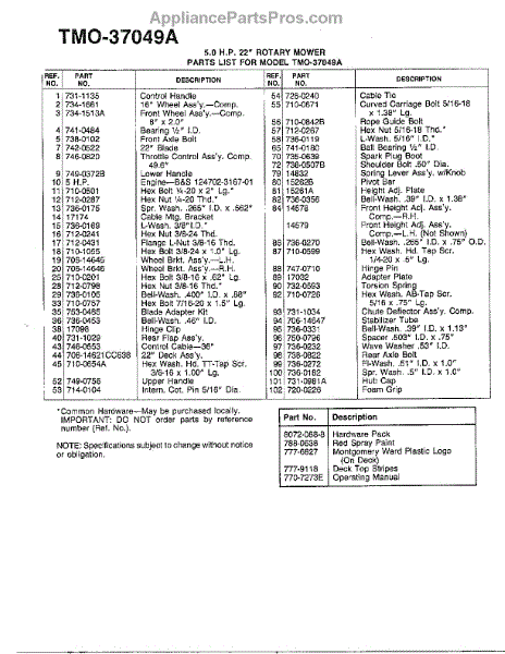 Parts for Mtd 37049A: 5.0Hp 22" Rotary Mower Page 2 Parts
