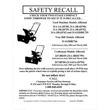 Parts for Yard Machines 31A-3BAD729 / 2005: -Safety Recall Parts