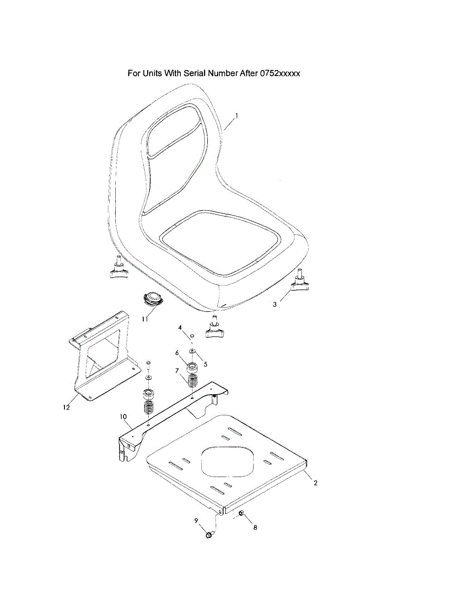 Low back seat assembly for riding mowers and zero-turn tractors. Replaces cracked, torn, or worn seats. Installs on seat platform with hardware.