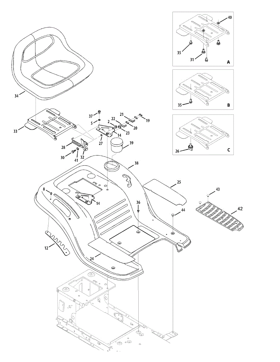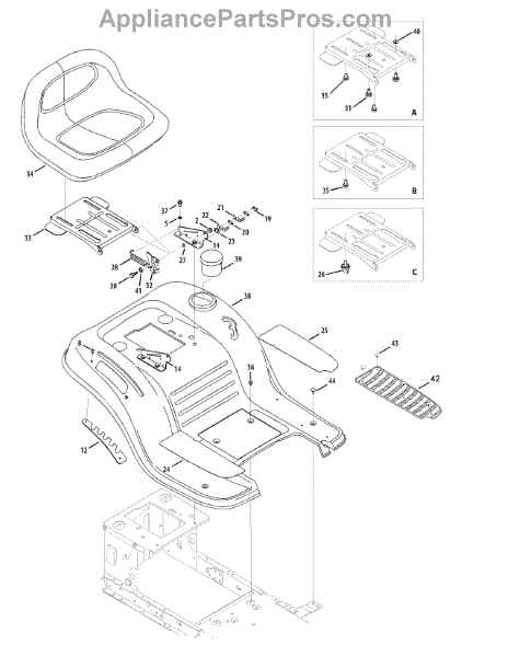 Replacement seat for front-engine lawn tractors. Installs on the seat platform for operator comfort. Needed when original is cracked, torn, or worn.