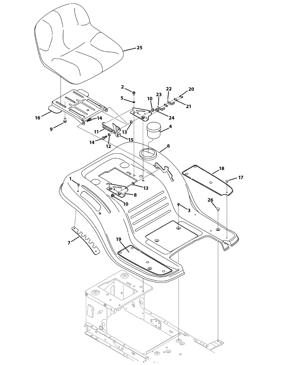 Right-side running board pad for lawn tractors. Mounts to the tractor frame to provide a footrest surface. Replace if cracked, worn, or missing.