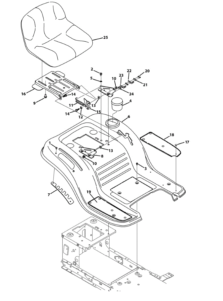 Seat mounting bracket for lawn tractors. Secures the seat to the tractor frame. Replace if cracked, bent, or broken to restore proper seat stability.