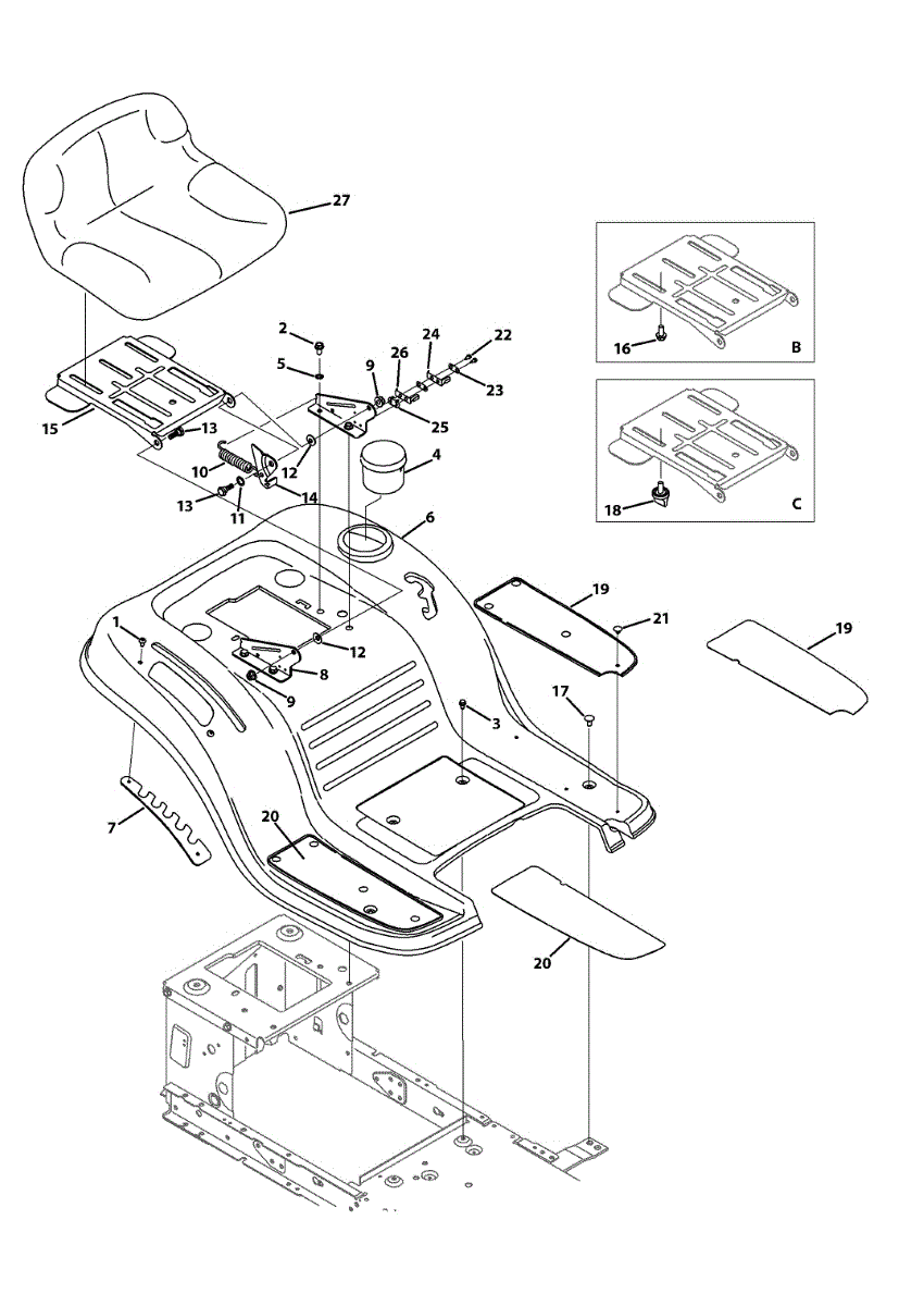 Seat mounting bracket for lawn tractors. Secures the seat to the tractor frame. Replace if cracked, bent, or broken to restore proper seat stability.