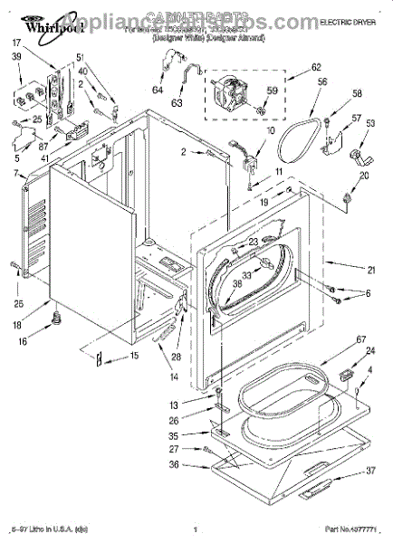 Fits all Whirlpool-made dryers (Whirlpool, Kenmore with prefix 110, Roper, KitchenAid, and Estate). Matching belt 341241 and rear support rollers 349241T. Whirlpool dryer repair manual 677818L.