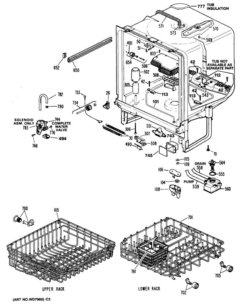 Replaces broken or cracked 3rd level spray arm assembly that mounts at the top of the tub. Includes mounting tabs and collar for secure installation.