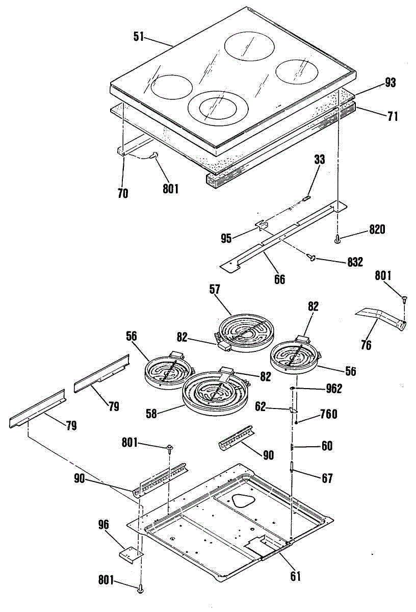 Glass main top assembly for ranges. Replaces cracked, chipped, or broken cooktop glass surfaces. Direct replacement for damaged top panels.