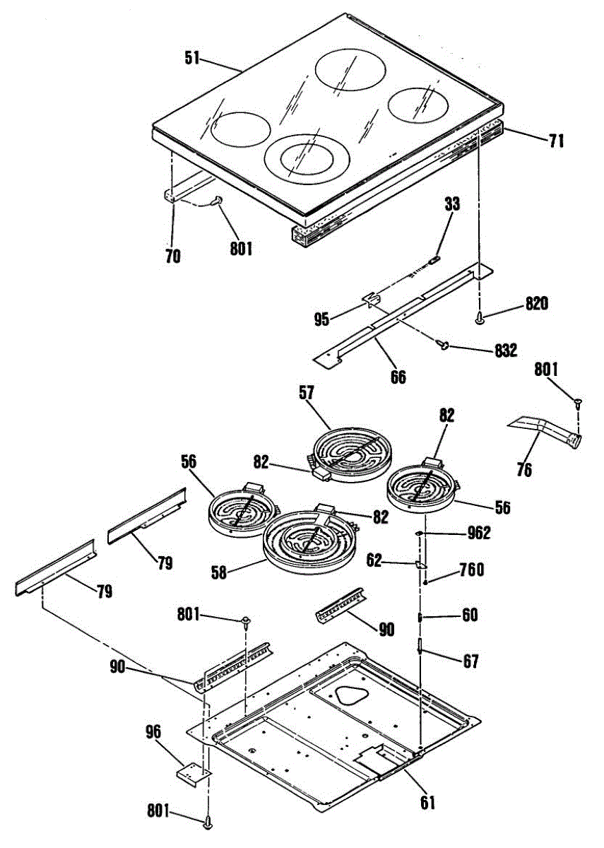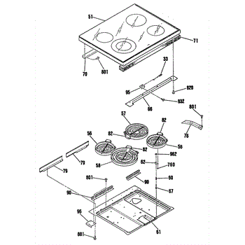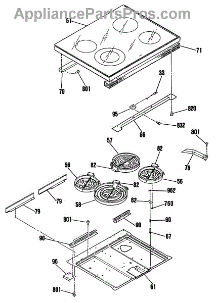 Glass main top assembly for ranges. Replaces cracked, chipped, or broken cooktop glass surfaces. Direct replacement for damaged top panels.