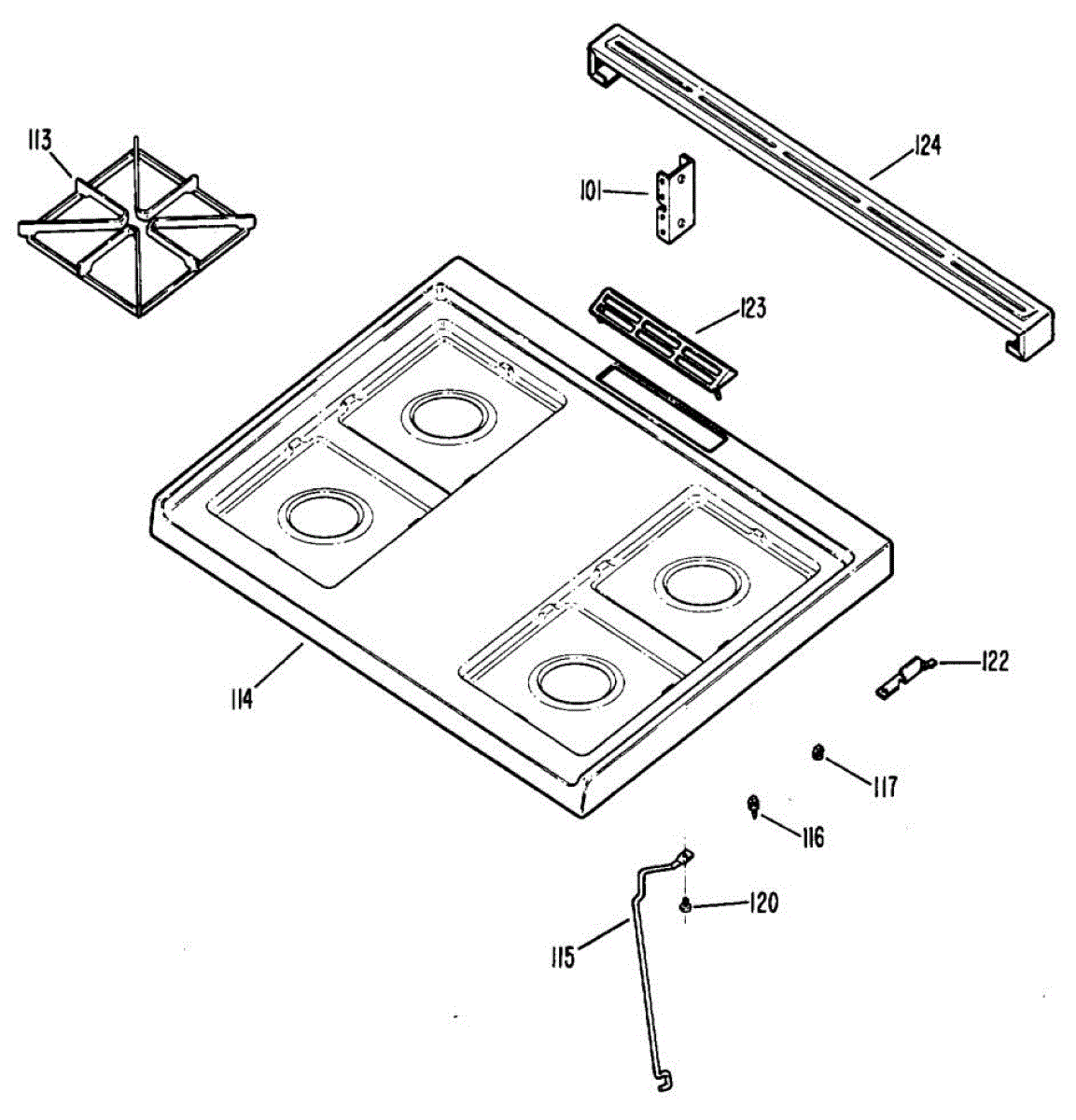 Left hinge guide secures and props up your range cooktop when lifted for cleaning or service. Replace if cracked, broken, or missing to restore secure support.