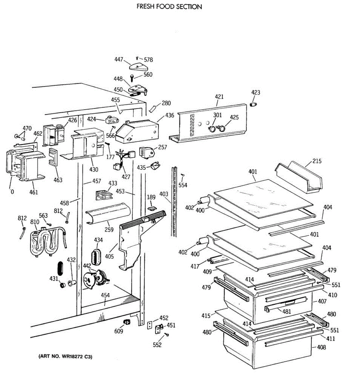 This left-hand drawer slide assembly mounts inside the refrigerator's fresh food section. It supports the shelf/cover and guides the drawer on its track, restoring smooth operation and proper alignment when the original rail is cracked or worn.