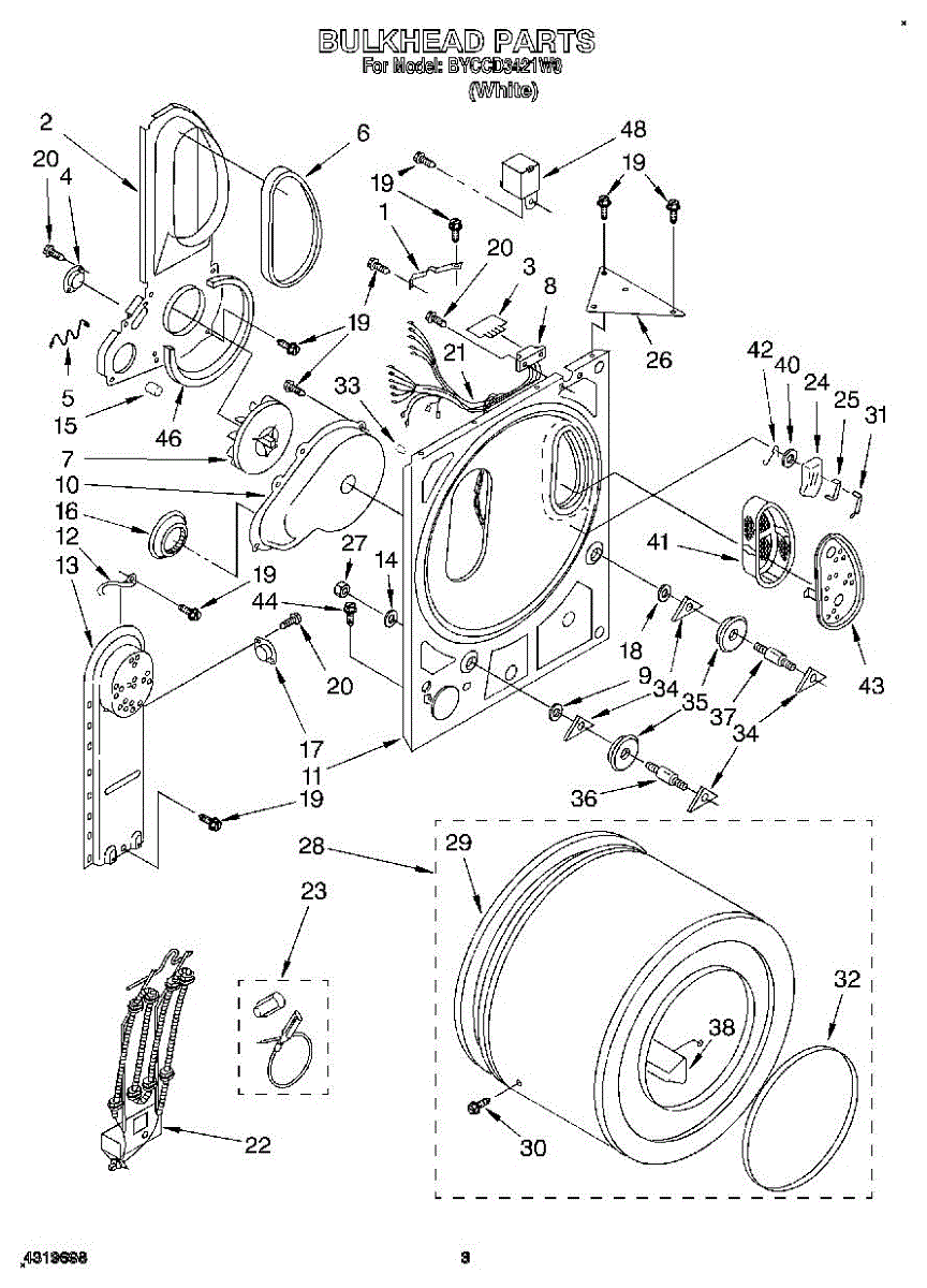 Front drum bulkhead for your dryer. This structural component supports the drum assembly. Replace if cracked, broken, or worn to restore proper drum support.