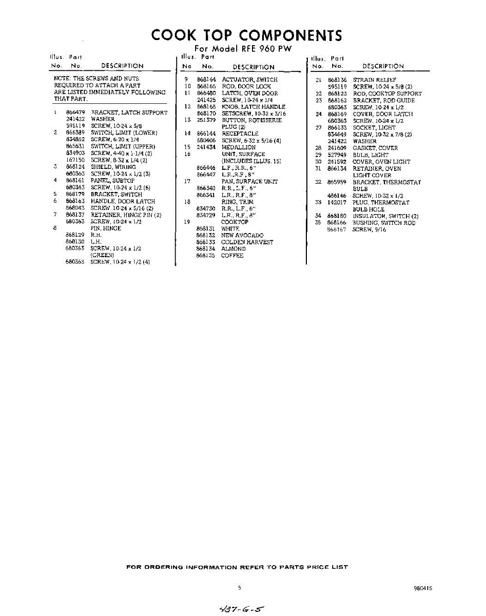 Parts for RFE960PW