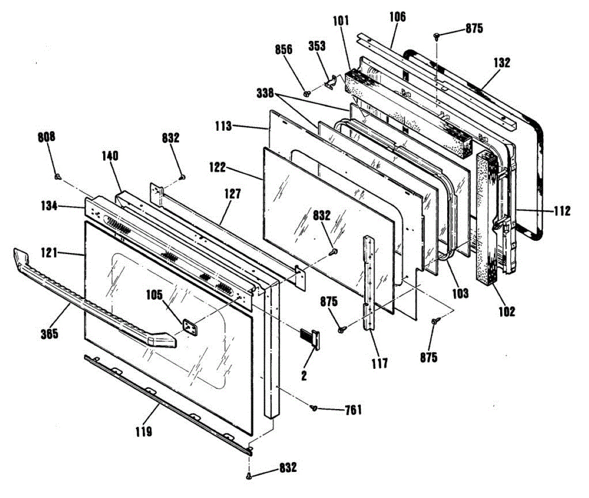 Inner oven door glass installs inside the door cavity behind the outer panel. Replace if shattered, cracked, or broken to restore viewing window function.