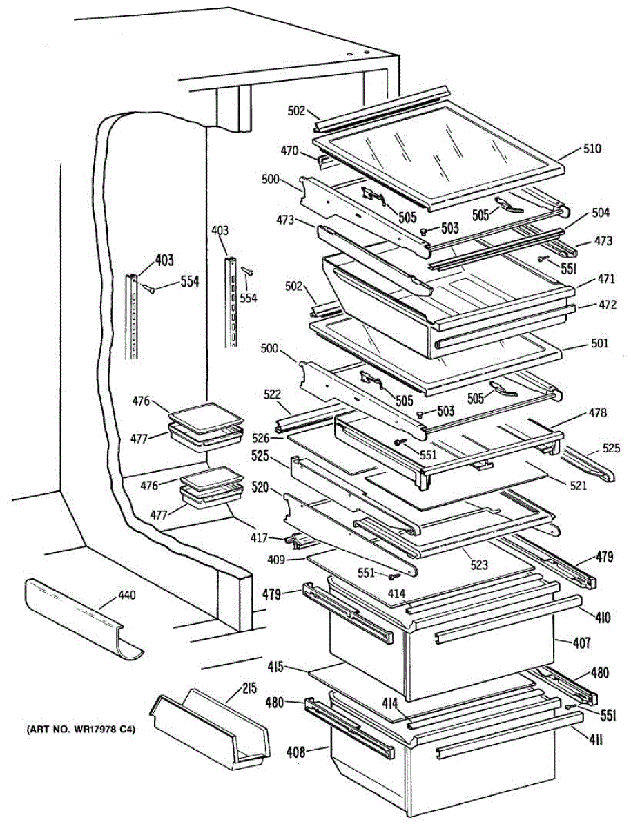 Cantilever shelf for side-by-side refrigerators. Replaces cracked, broken, or damaged shelving. Slides out for easy access to stored items.