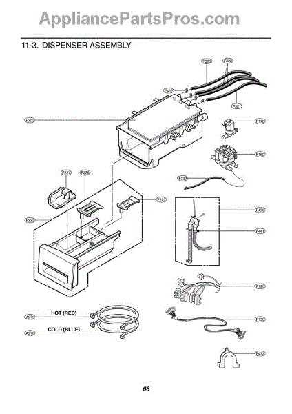 The Dispenser Assembly is an OEM part for LG front-loading washers. It is responsible for dispensing detergent and fabric softener at the appropriate times during the wash cycle. The dispenser assembly contains separate compartments for detergent and fabric softener, as well as timed mechanisms that release each additive when needed for cleaning and softening results.