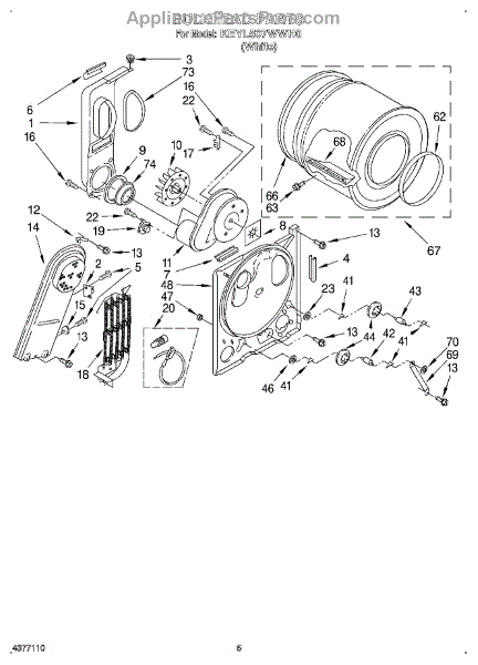 This is a drum assembly intended for use with dryers. This part can be found inside the dryer and is responsible for holding clothing while a cycle is running. It holds wet laundry while loading the appliance. Over time and with use, the drum assembly can start to wear out. This can cause the dryer to squeal, start and stop during a cycle, make buzzing noises, or seize up.If the drum assembly is damaged, it will need to be replaced. Make sure to have basic tools and a pair of work gloves ready. The dryer should be turned off and unplugged from the wall. Raise the top panel, remove the front panel, and then remove the drum. The drum support roller should be taken out and installed on the new drum. Reinstall with the new component and reassemble all parts before use.The drum assembly is made to be used with dryers and washer/dryer combos from Inglis, Estate, Admiral, Crosley, Roper, Magic Chef, Amana, KitchenAid, Maytag, Kenmore, and Whirlpool. It is a genuine OEM replacement part that is sourced directly from the manufacturer. The part is sold on an individual basis.