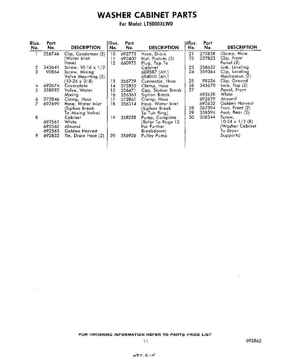 Parts for Whirlpool LT5000XLW0: 11 - Section Parts