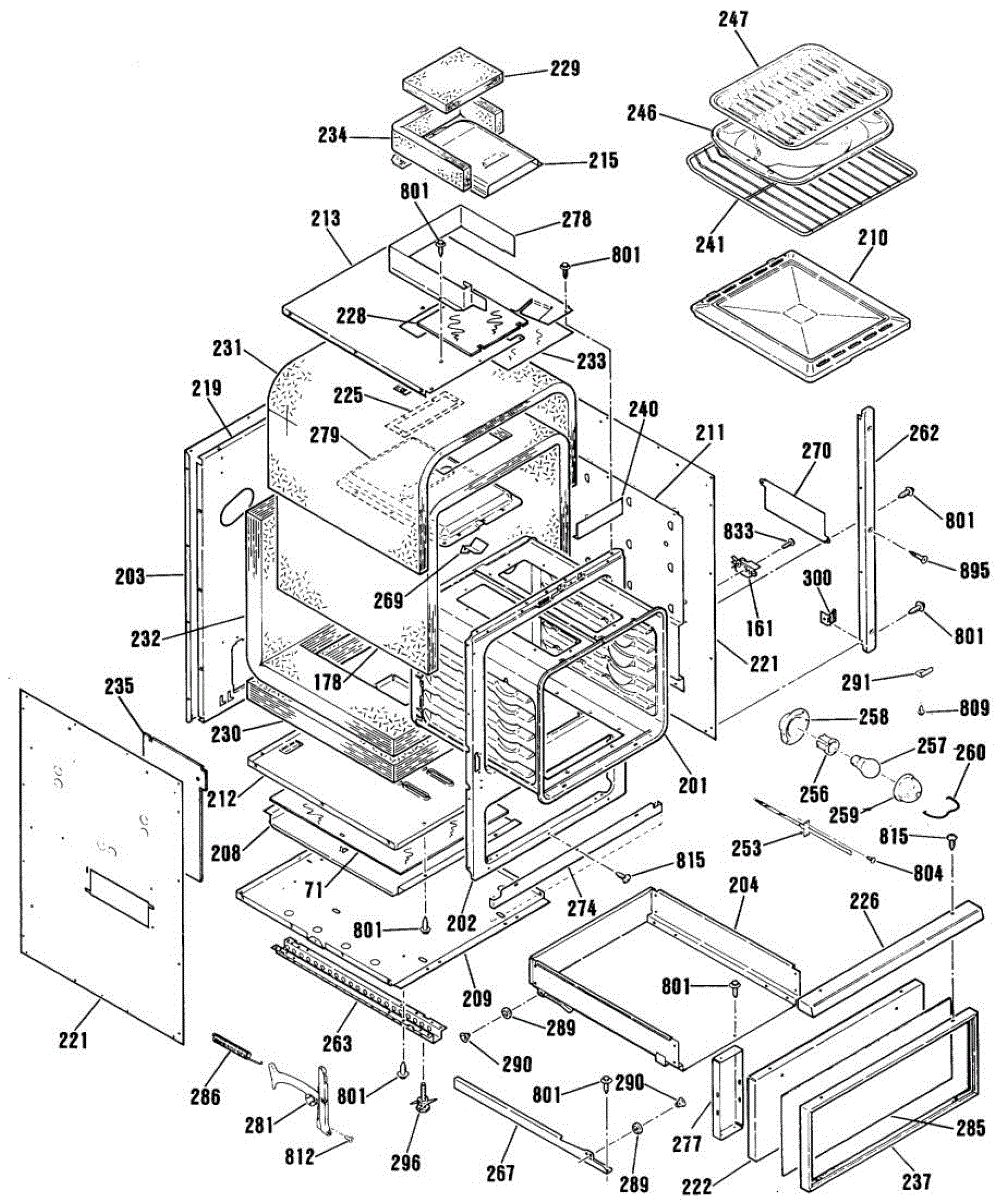 Drawer slide guide assembly for ovens and ranges. Replaces broken or worn drawer glides that cause drawers to stick, sag, or fall off track.