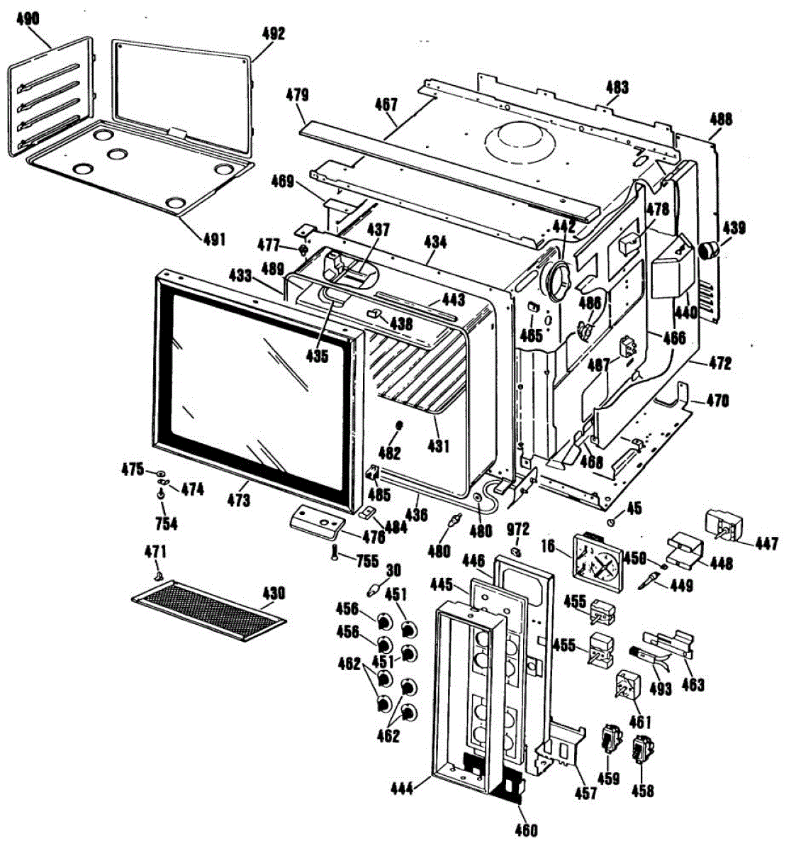 Mounting screw secures panels, trim, and internal components in ranges and ovens. Replace if missing, stripped, or damaged to restore proper fit.