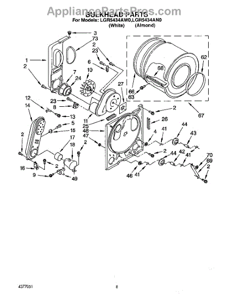 Replacement drum front bulkhead for dryers. Installs at the front of the drum assembly. Needed when original is cracked, damaged, or worn out.