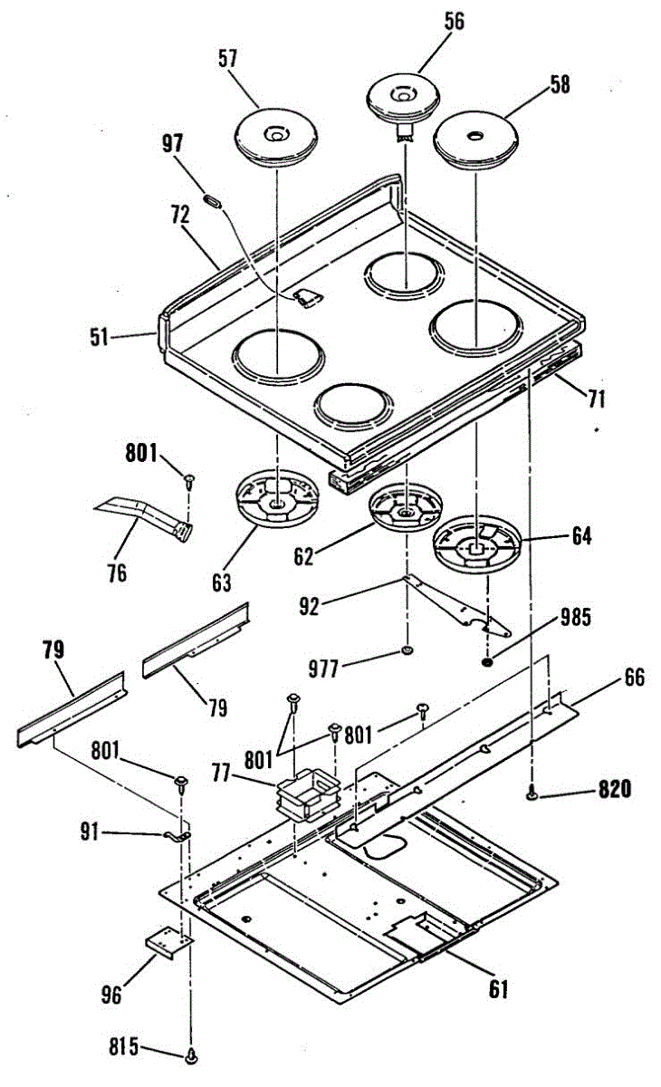 Metal main top for ranges. Replaces cracked, chipped, or worn cooktop surfaces. Installs over burner assembly to restore appearance and function.
