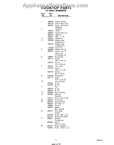 Parts for Whirlpool RHM955PW: 09 - Section Parts