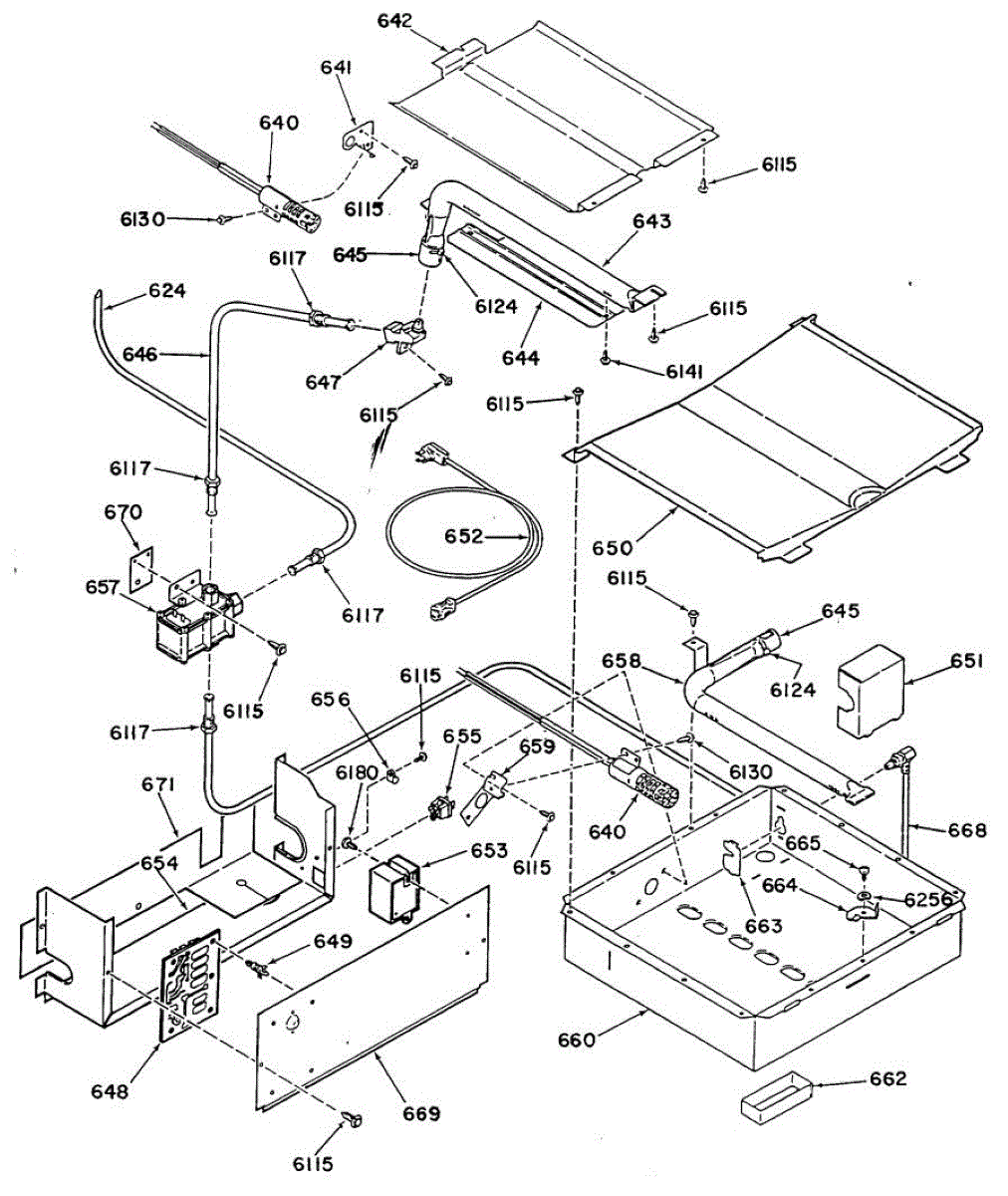 Sheet metal baffle that directs heat across the broiler chamber for even cooking. Replace if cracked, warped, or corroded to restore proper heat distribution.