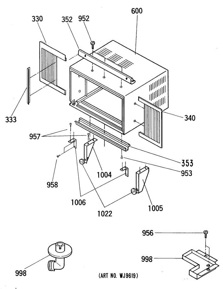 Mounting screw for air conditioner installation. Secures unit to window frame or bracket. Replace if stripped, missing, or corroded during maintenance.