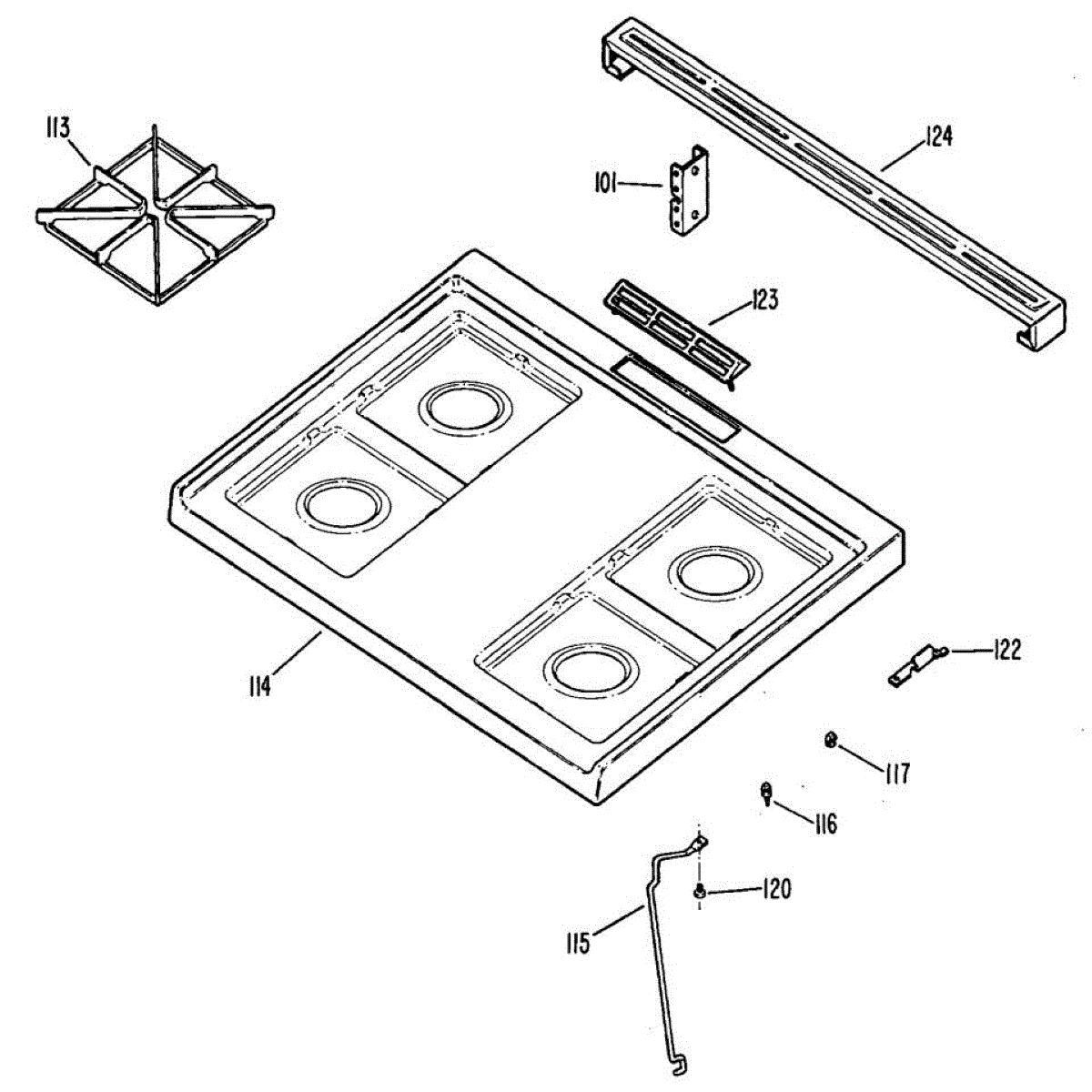 Left hinge guide secures and props up your range cooktop when lifted for cleaning or service. Replace if cracked, broken, or missing to restore secure support.