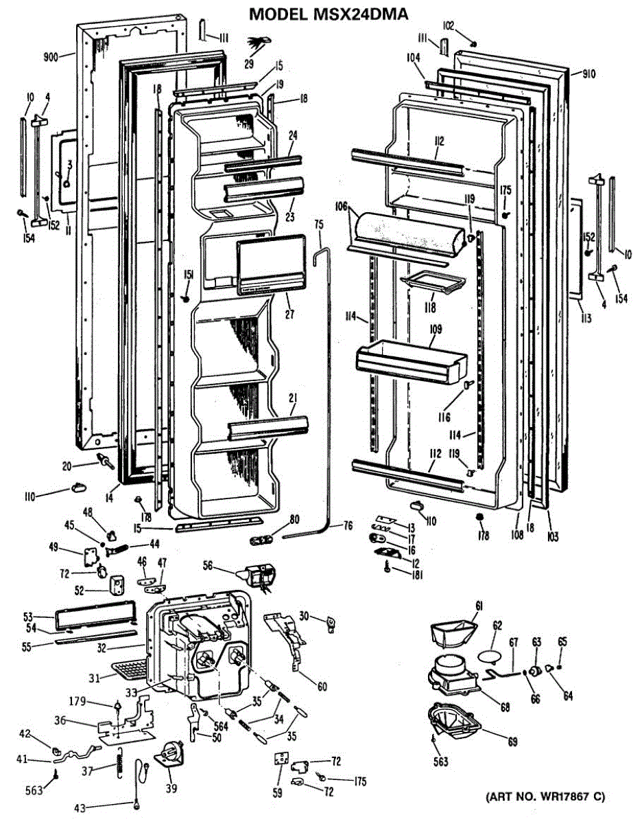 Hardware fasteners for securing refrigerator door panels and components. Includes screws, nuts, and washers for assembly. Replace missing or stripped pieces.