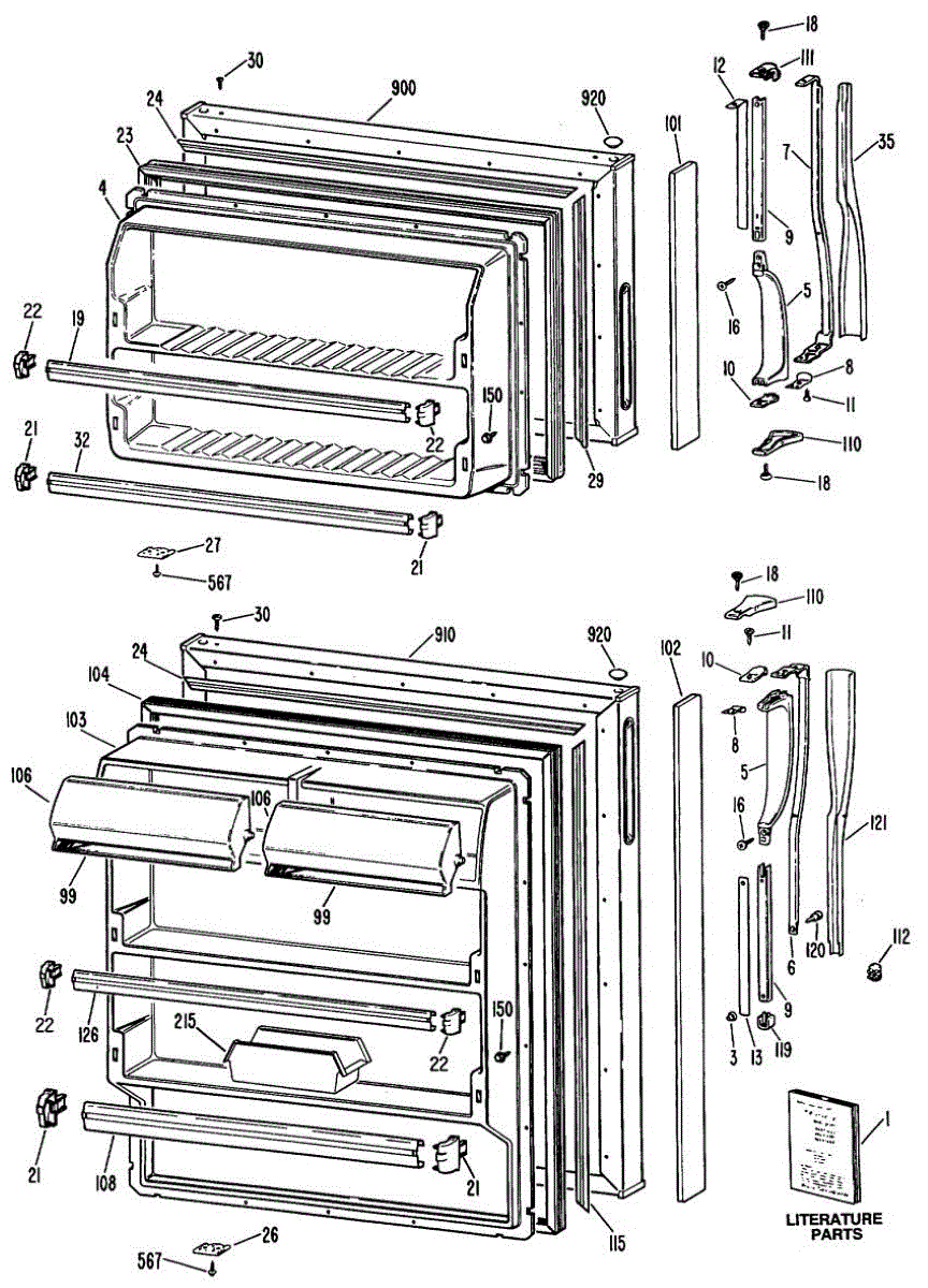 Hardware fasteners for securing refrigerator door panels and components. Includes screws, nuts, and washers for assembly. Replace missing or stripped pieces.