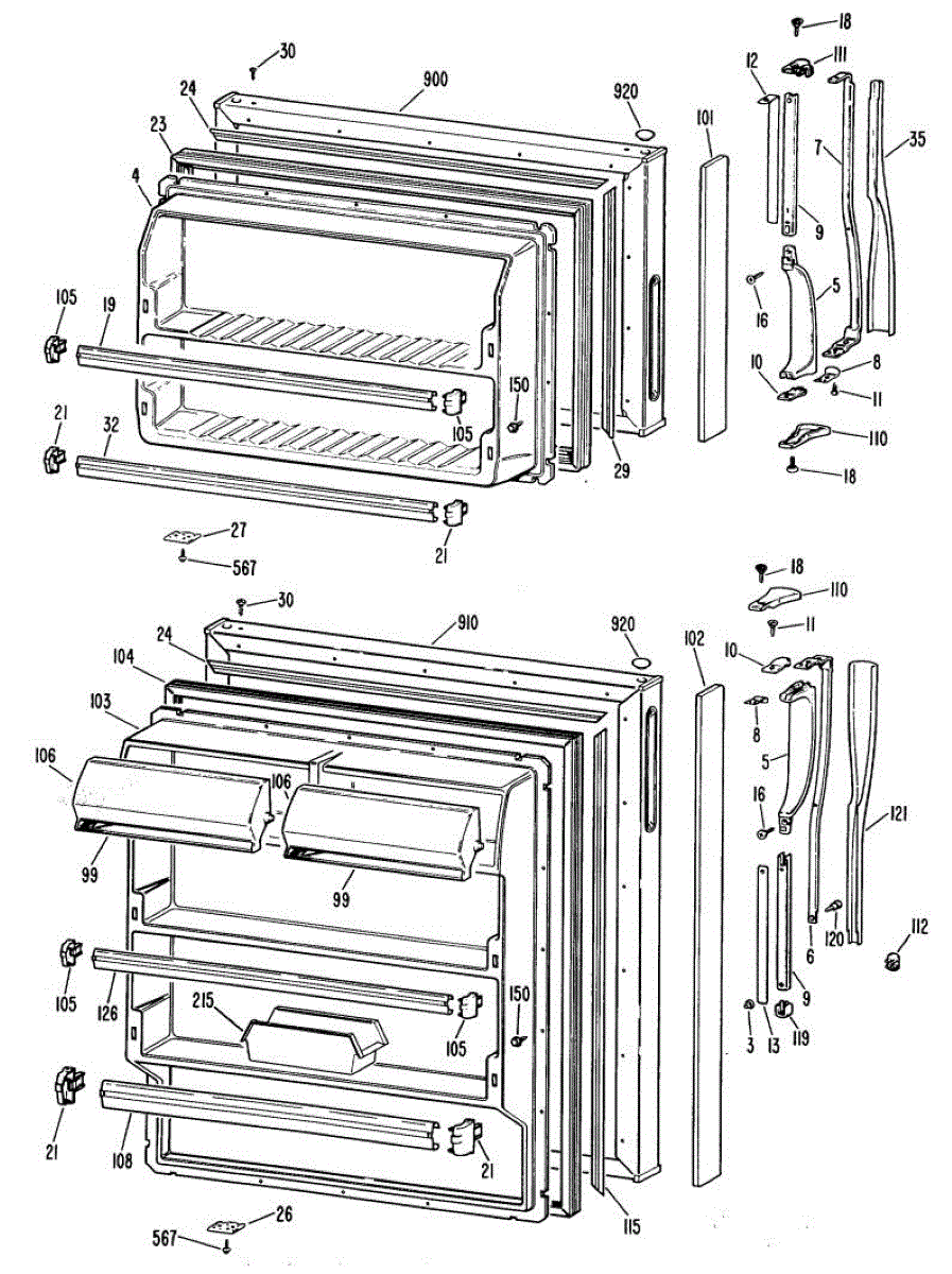 Hardware fasteners for securing refrigerator door panels and components. Includes screws, nuts, and washers for assembly. Replace missing or stripped pieces.