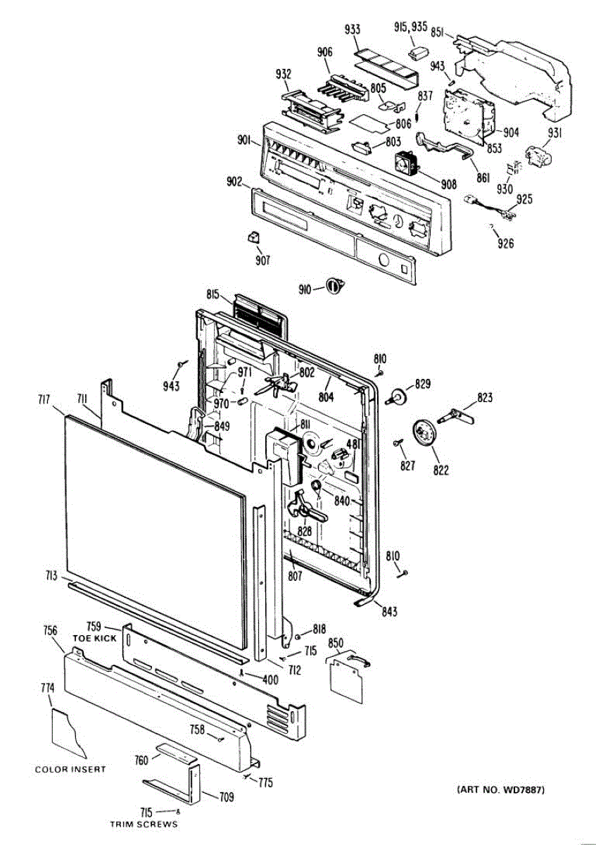 Lower access panel insert for dishwashers. Installs behind the silver trim at the bottom front of the unit. Replace if cracked, loose, or missing.