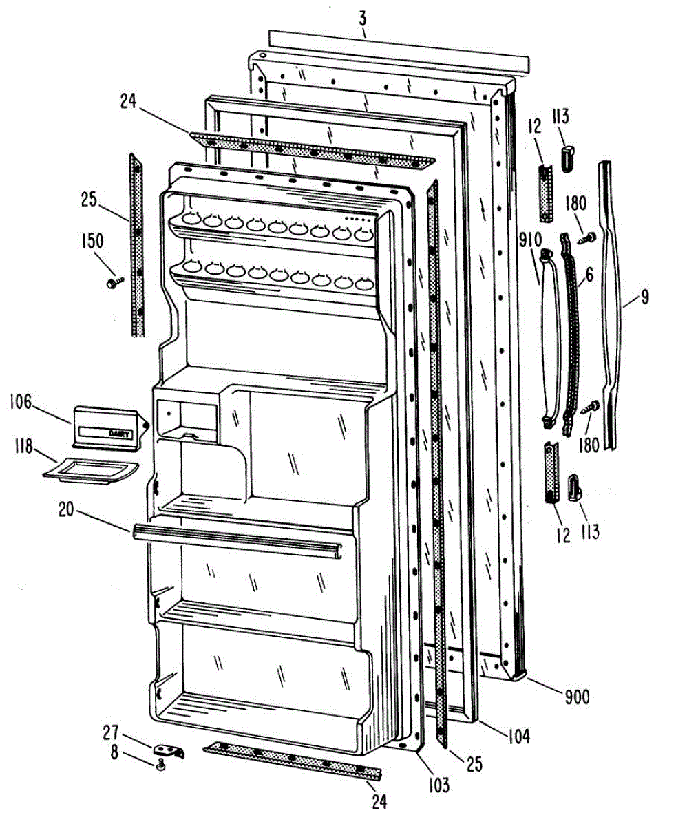 Mounting screw for refrigerator assembly and component attachment. Replace missing, stripped, or corroded screws during repair or maintenance work.