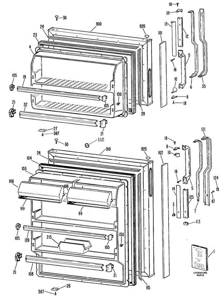 Hardware fasteners for securing refrigerator door panels and components. Includes screws, nuts, and washers for assembly. Replace missing or stripped pieces.
