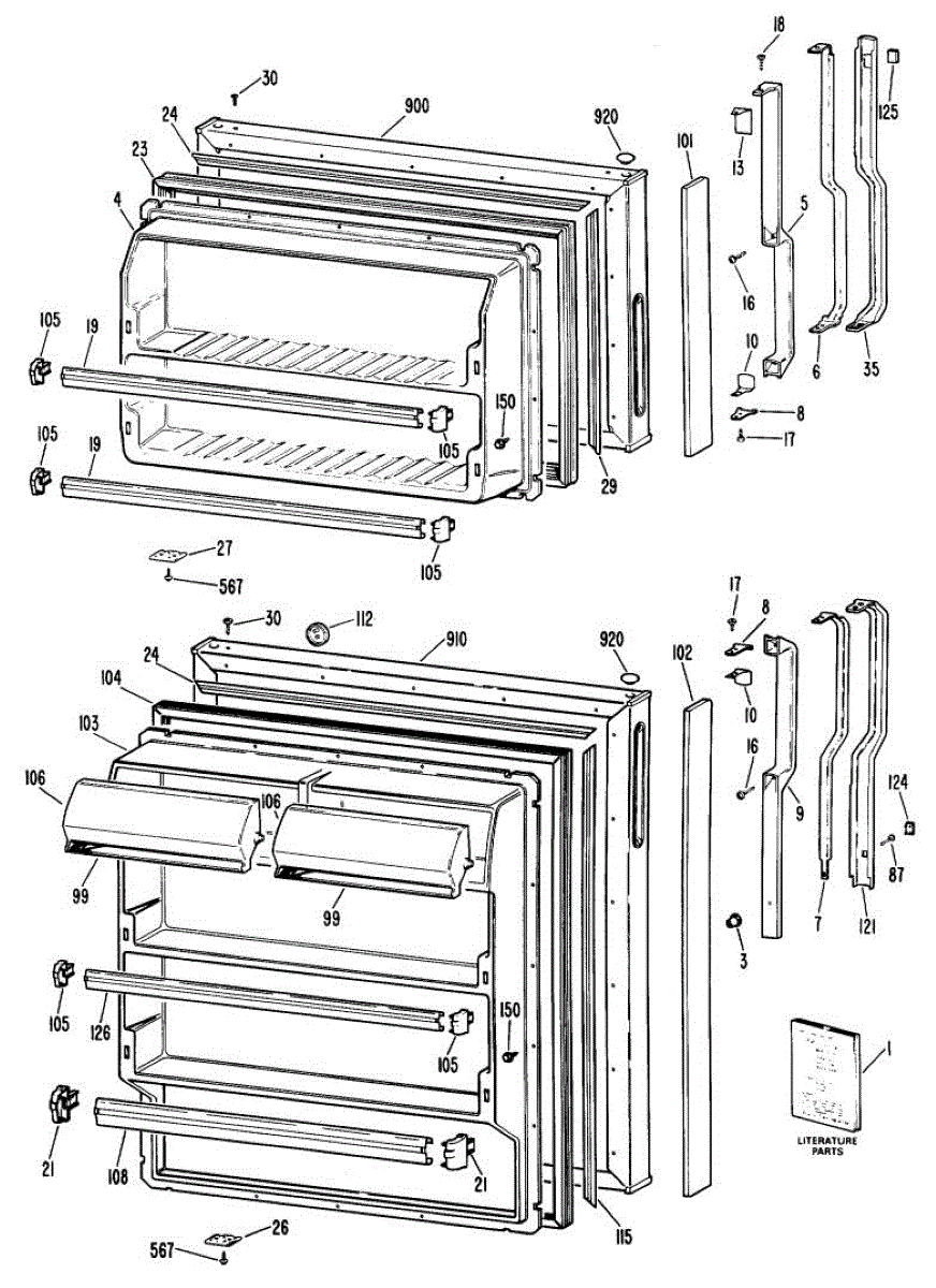 Hardware fasteners for securing refrigerator door panels and components. Includes screws, nuts, and washers for assembly. Replace missing or stripped pieces.